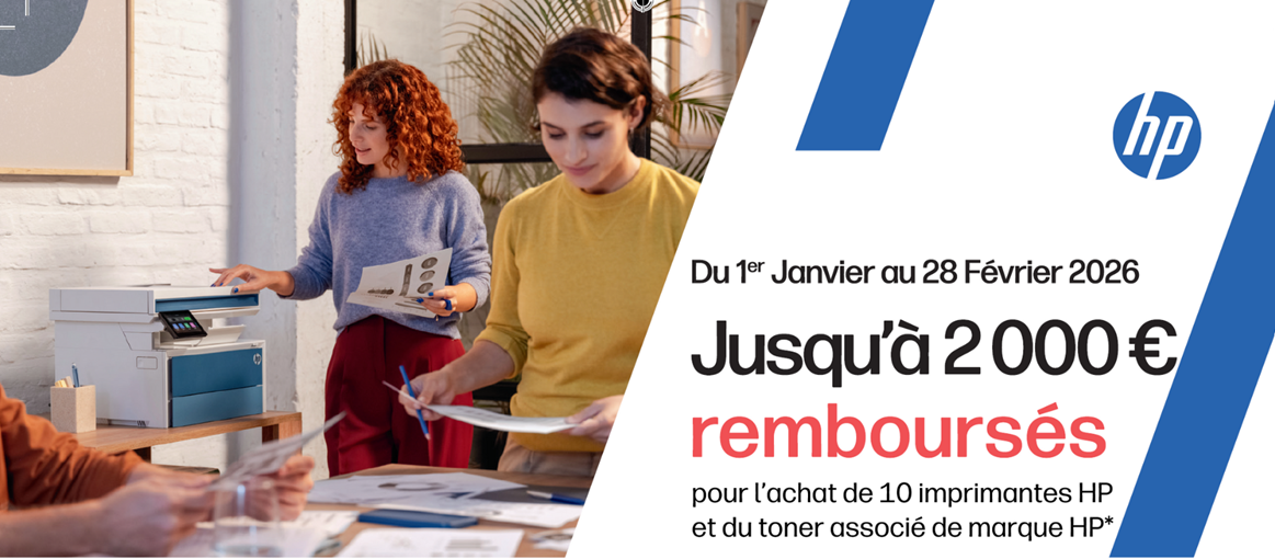 Offre de remboursement HP valable en France du 01/01/2026 au 28/02/2026 sur sélection de produits Laser A4 (et certains scanners). Montant variable selon le modèle et achat simultané du toner HP associé. 10 demandes maximum par entité juridique sur la période. Preuve d’achat requise. Détails et demande sur hp.com/fr/offrelaser. Offre dans la limite des stocks disponibles.